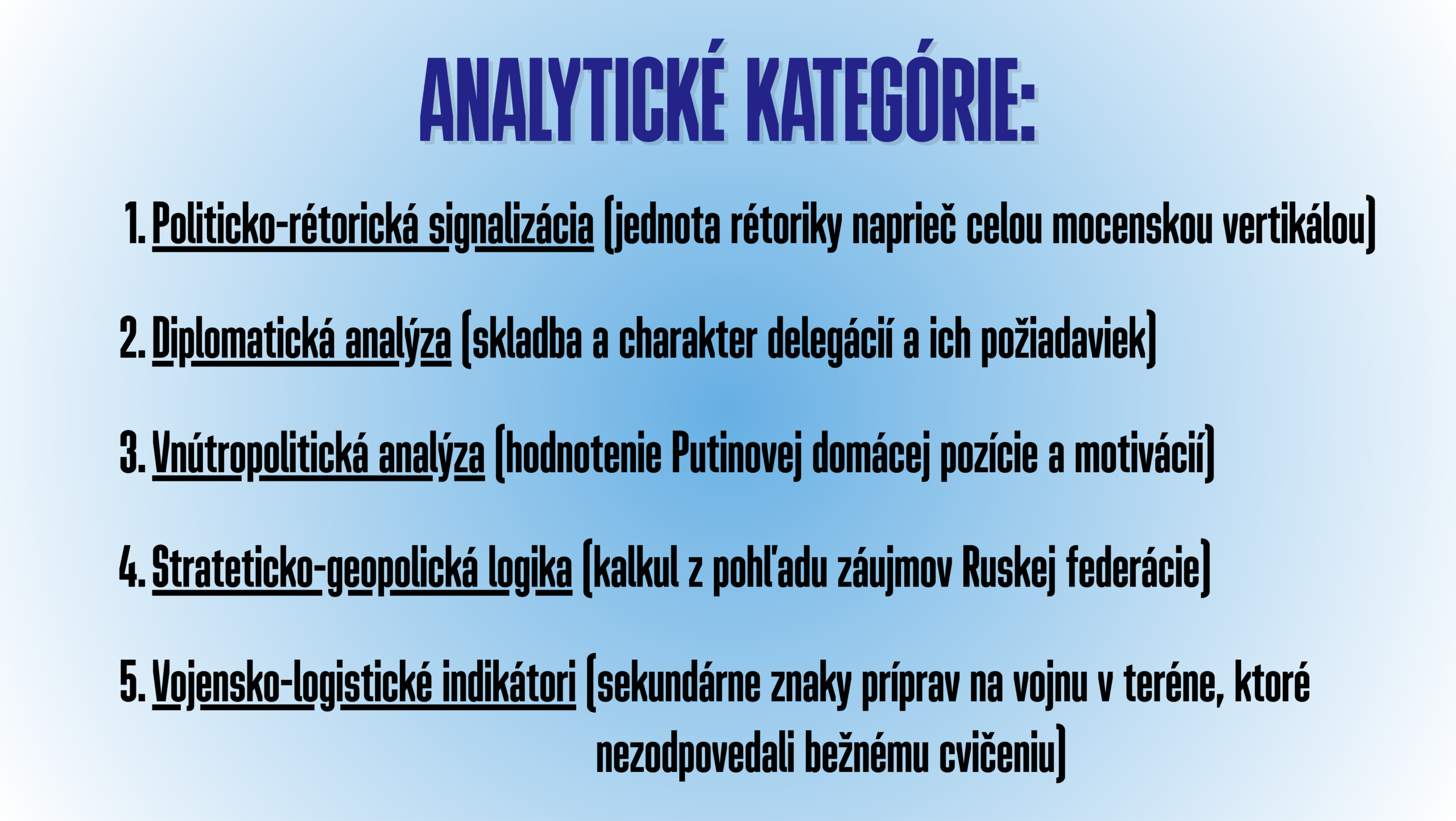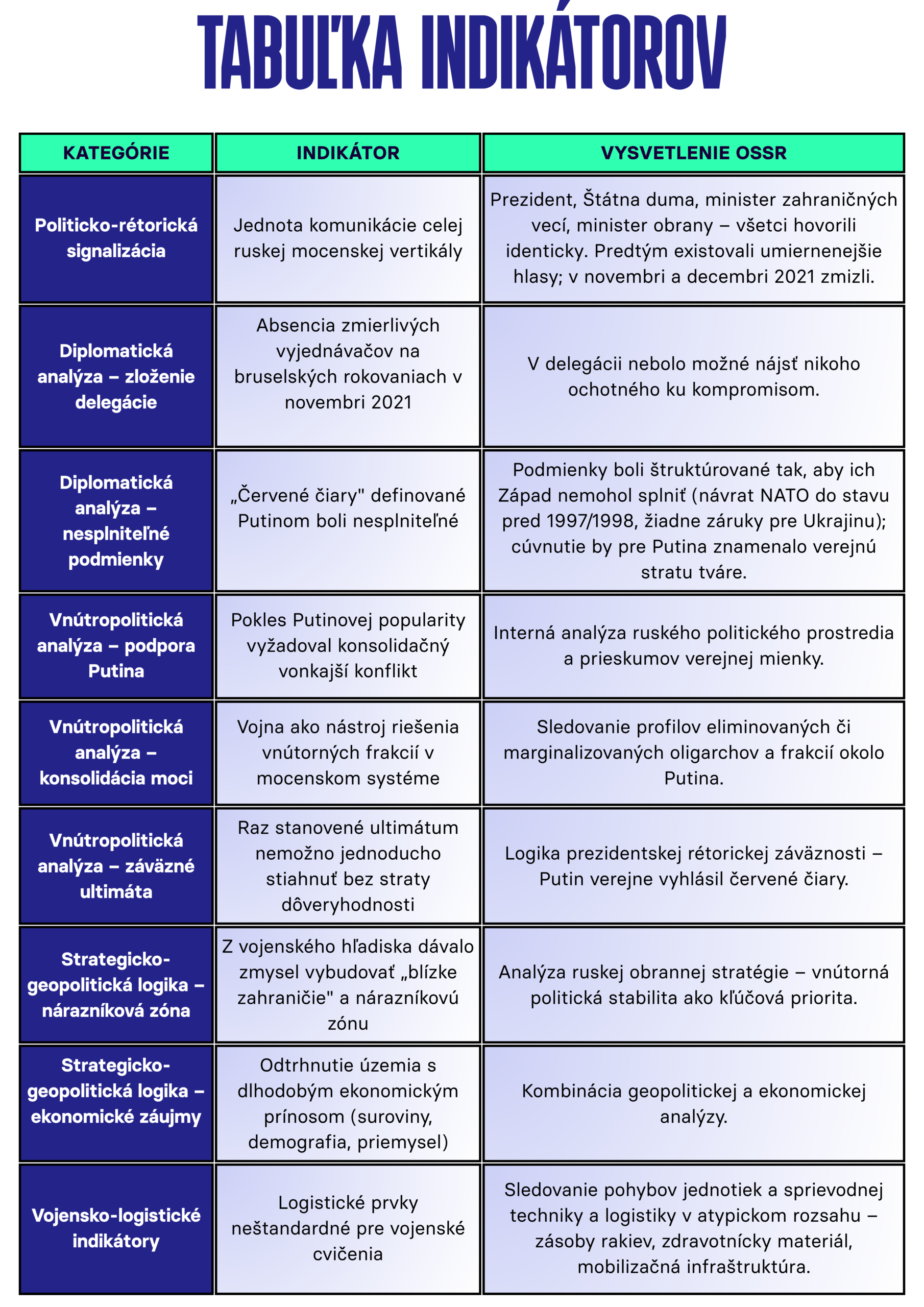 Možno predpokladať, že Ozbrojené sily mali k dispozícii aj ďalšie informácie, ktoré nezverejnili alebo ktoré sme prehliadli. Uvedené kategórie však ponúkajú pomerne podrobný obraz o tom, ako analytici OSSR uvažovali pri hodnotení pravdepodobnosti ruského útoku. Zaujímavé je, že vojenské a logistické indikátory považovali len za doplnkové, pričom najvýznamnejšiu úlohu zohrávala vnútropolitická situácia.